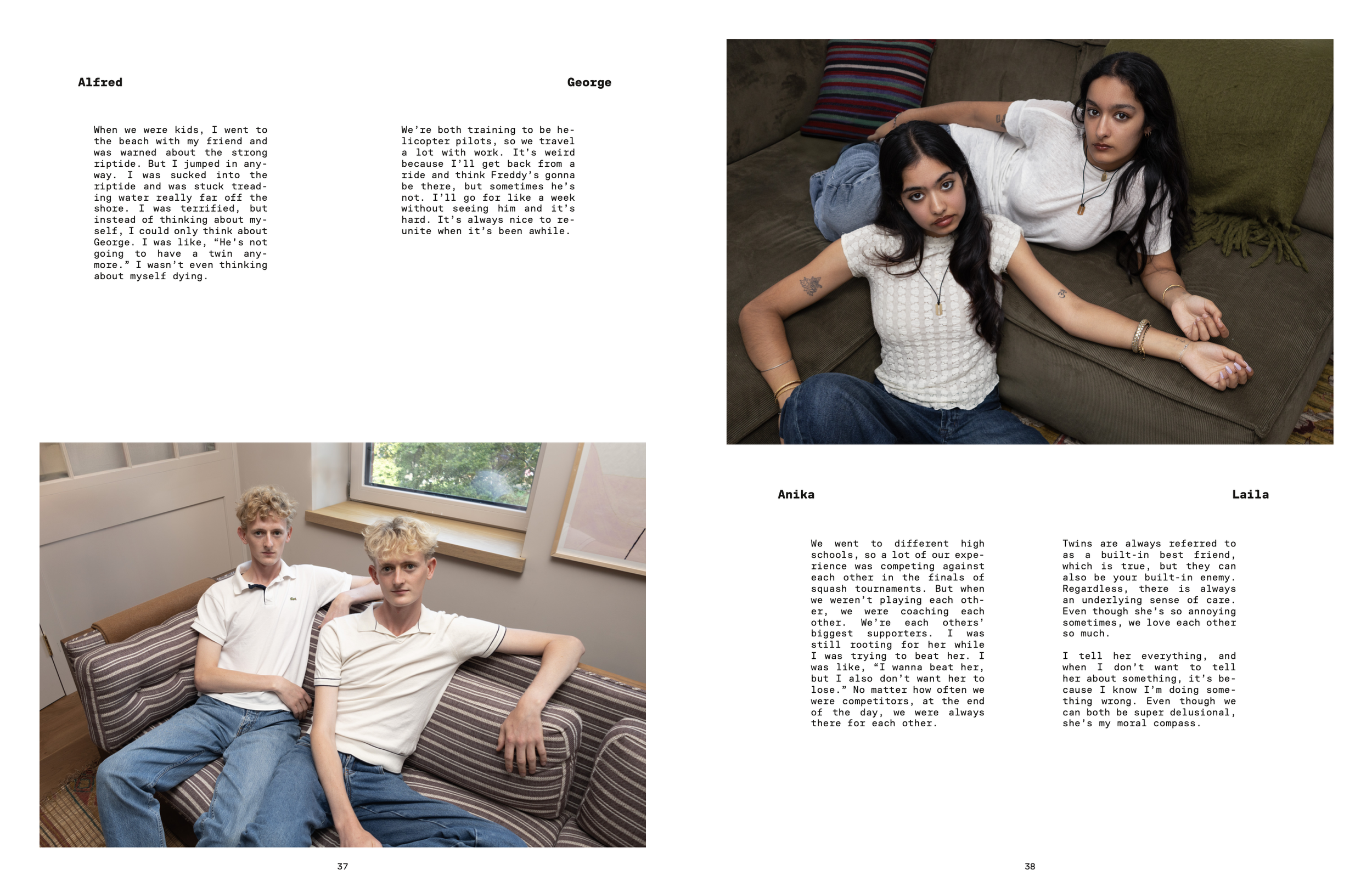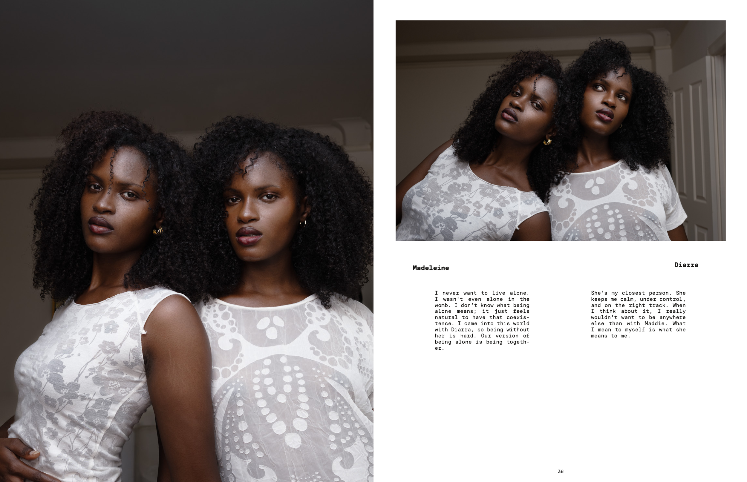 Shot for Bias Cut Magazine Issue 02: Since Birth, this series reckons with Lacan’s psychoanalytic theory of reflection and ego observed in infants. When observing their own reflection in a mirror, infants are unable to discern it as separate from themselves. This misrecognition of self that occurs in the mirror stage can create a false illusion of wholeness or an idealized image of “I.” While most children grow out of this stage, twins see their own reflection in another person for their entire lives.